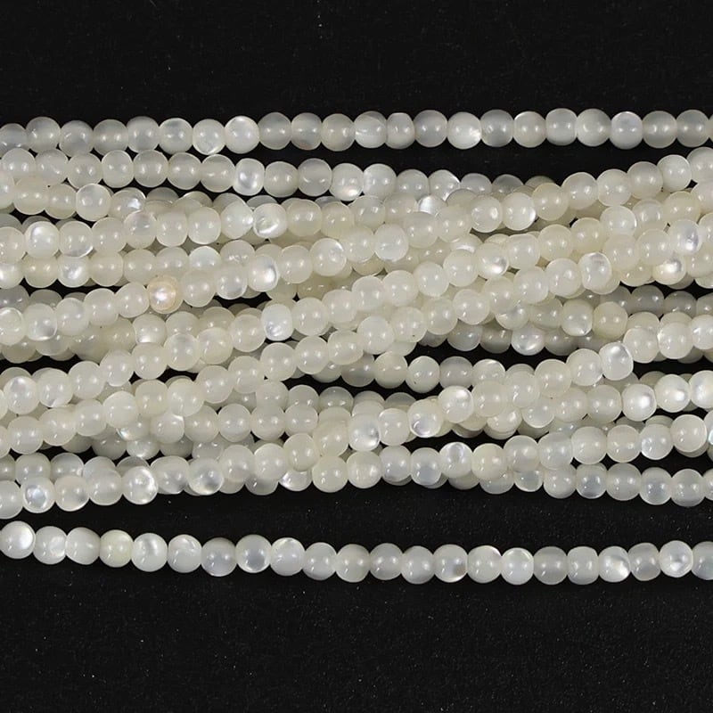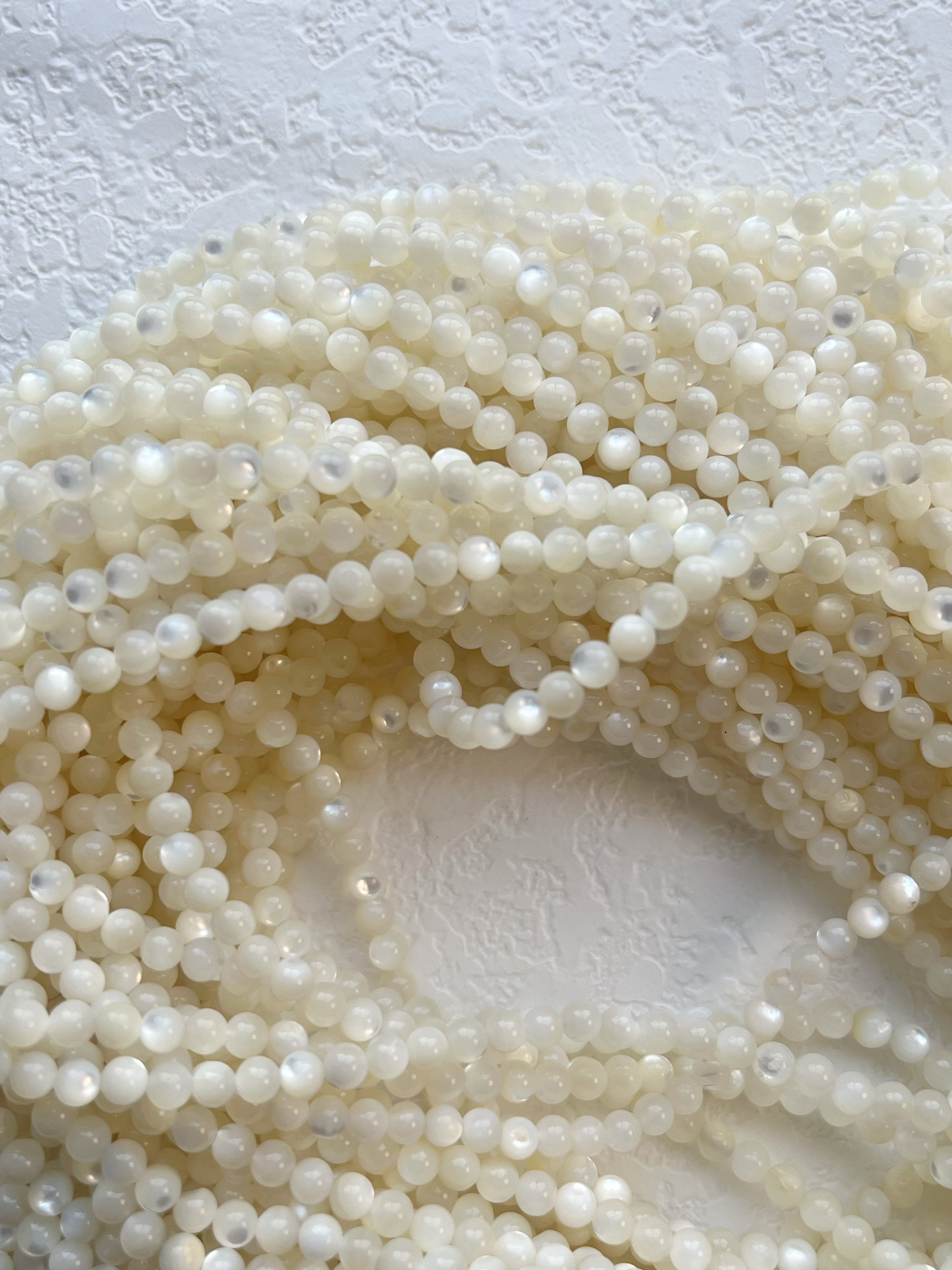 柔らかなミルキーホワイトが魅力のマザーオブパール(白蝶貝)丸玉ビーズです。